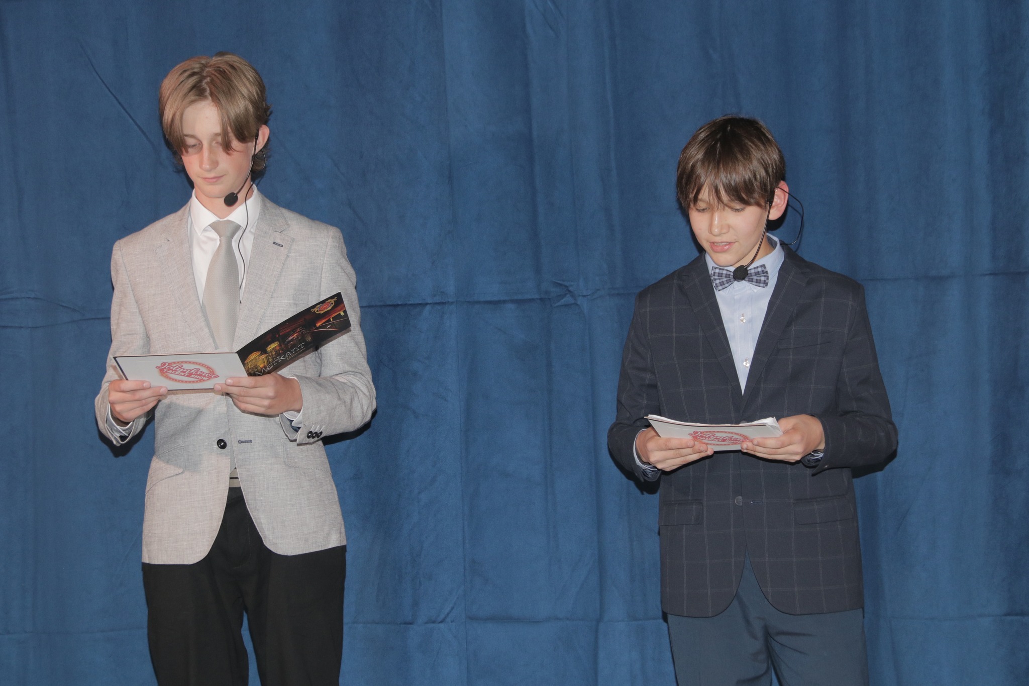 Całą uroczystość z wdziękiem i humorem poprowadzili uczniowie klasy siódmej – Mikołaj Purpurowicz i Wojciech Kaźmierczak.